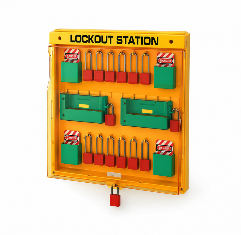 Станция закрытого типа для хранения LOTO замков с прозрачной крышкой. Вмещает 16-32 навесных замка и 2 слота для мобильных телефонов, 2 кармана для бирок. Можно хранить замки как с короткой, так и с длинной дужкой 76 мм. Изготовлена из прочного пластика, закрывается на навесной замок. Станцию без крышки можно заказать под артикулом BD-B203W.