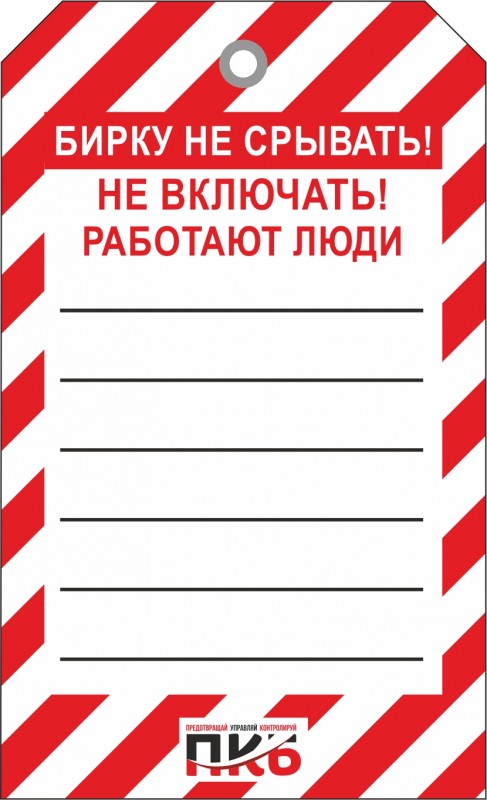 Информационная бирка "Не включать, работают люди" арт. PKBS81, для одноразового использования, односторонняя. Изготовлена из пластика, толщиной 0,3 мм, оснащена металлическим люверсом Ø 8 мм . По желании заказчика толщина бирки может быть увеличена до 1-2 мм. Нанесение текста можно производить маркером или ручкой. Размер 70 х 115 х 0,3мм.